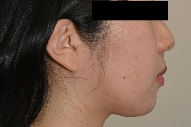 - 口唇の突出を気にされて来院いたしました。Eラインより口唇の突出、オトガイ部の緊張を認めました。アンカースクリューを用いて前歯の牽引を行うことによって良好な側貌となりました。治療途中で遠方に引っ越されたため来院が困難となり治療期間が延びてしまいましたが、患者様のご協力もあり無事に治療を終えることができました。