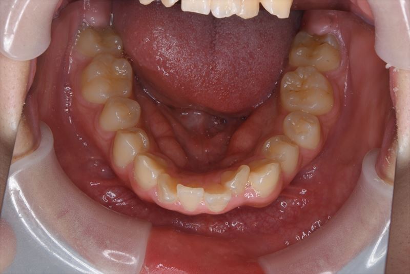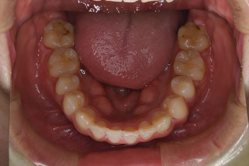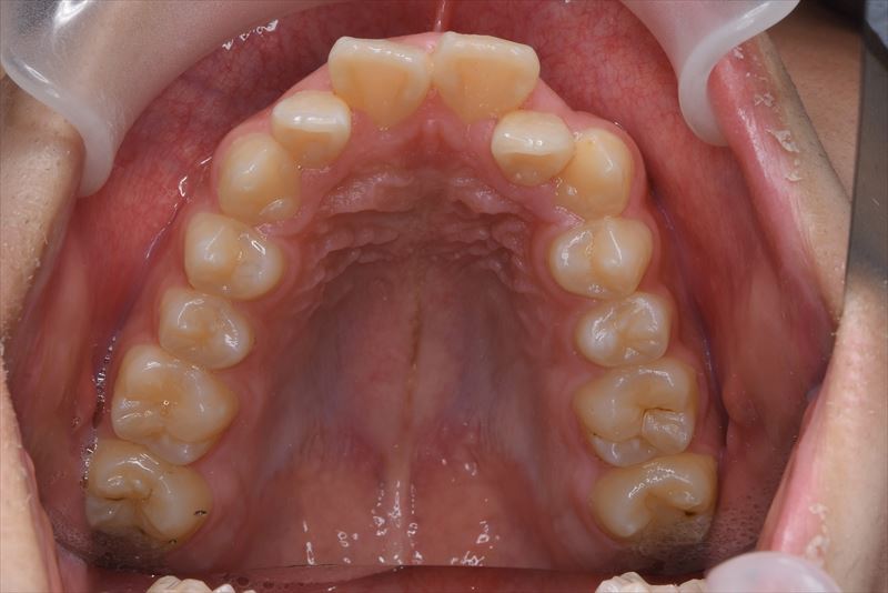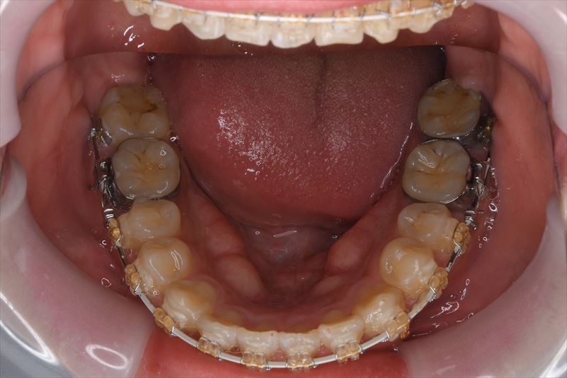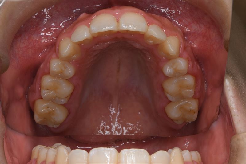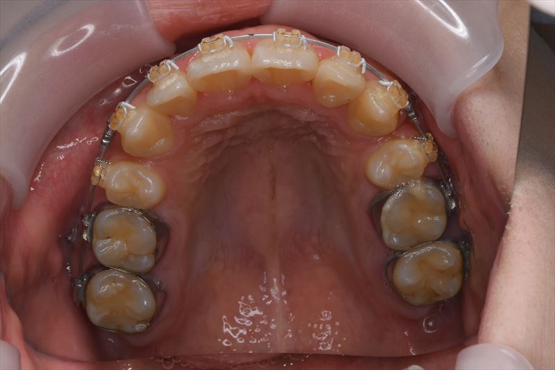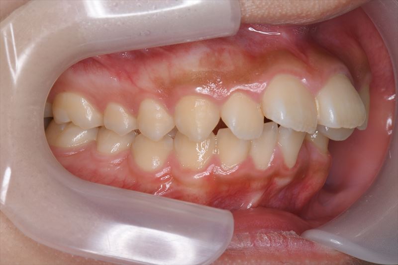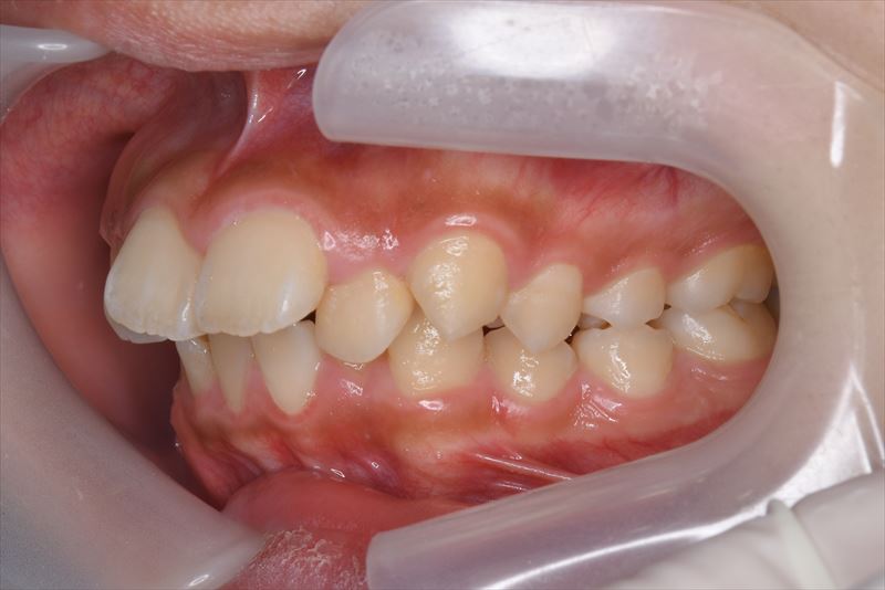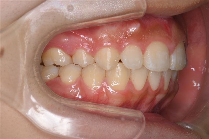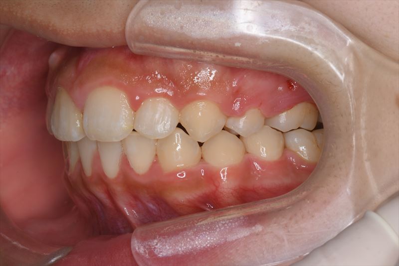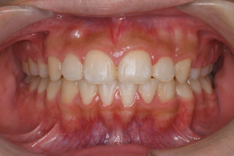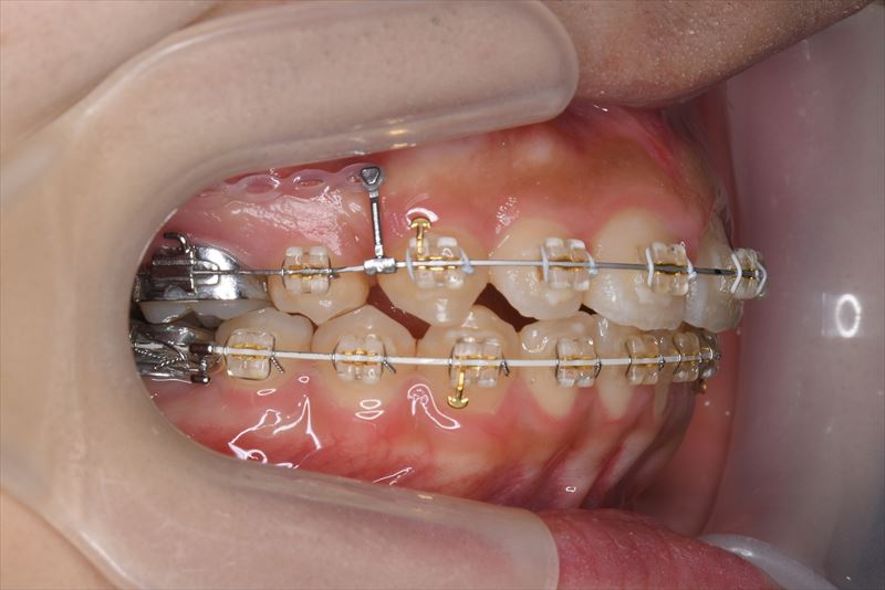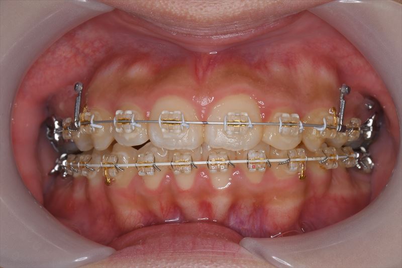 骨格的な上顎前突と過大なオーバージェットを認めたため、上顎両側4番を抜歯して上顎前歯をアンカースクリューを用いて牽引しました。良好な前歯の関係と緊密な咬合を獲得しました。